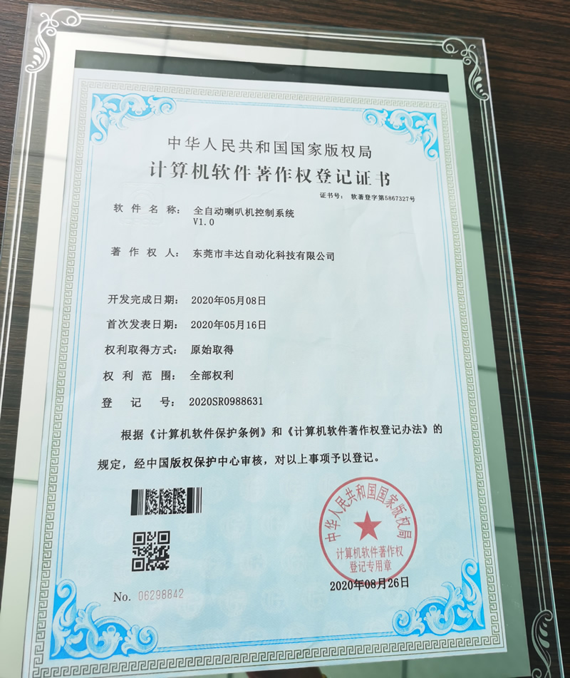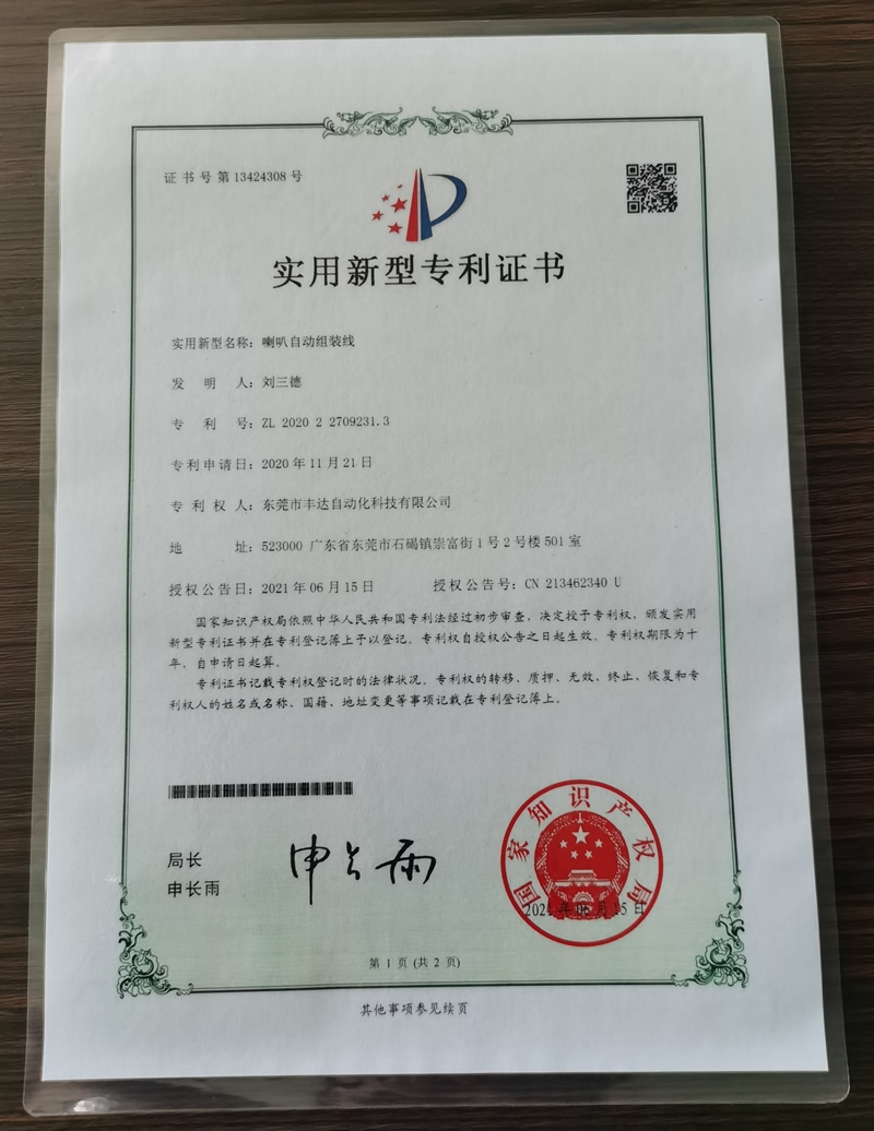 喇叭自动组装线.实用新型专利证书