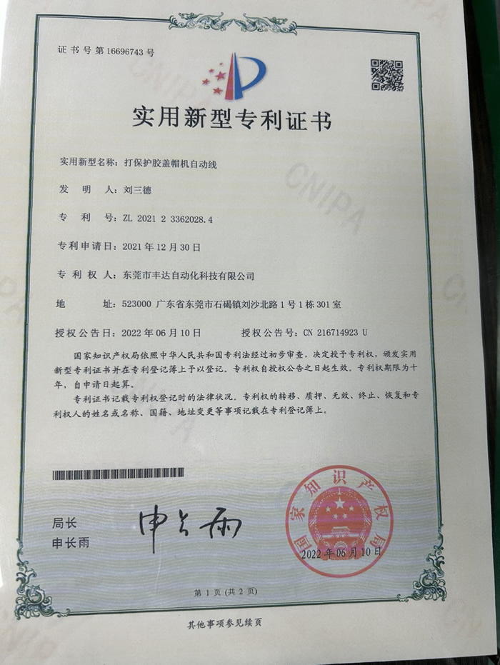 打保护胶盖帽机自动线.实用新型专利证书