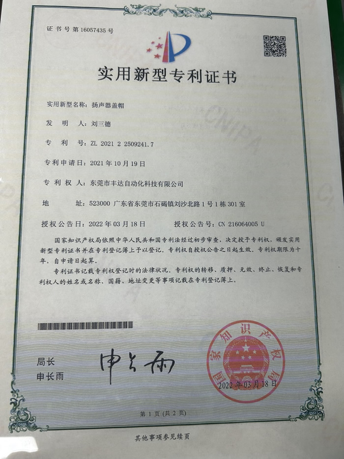 扬声器盖帽.实用新型专利证书
